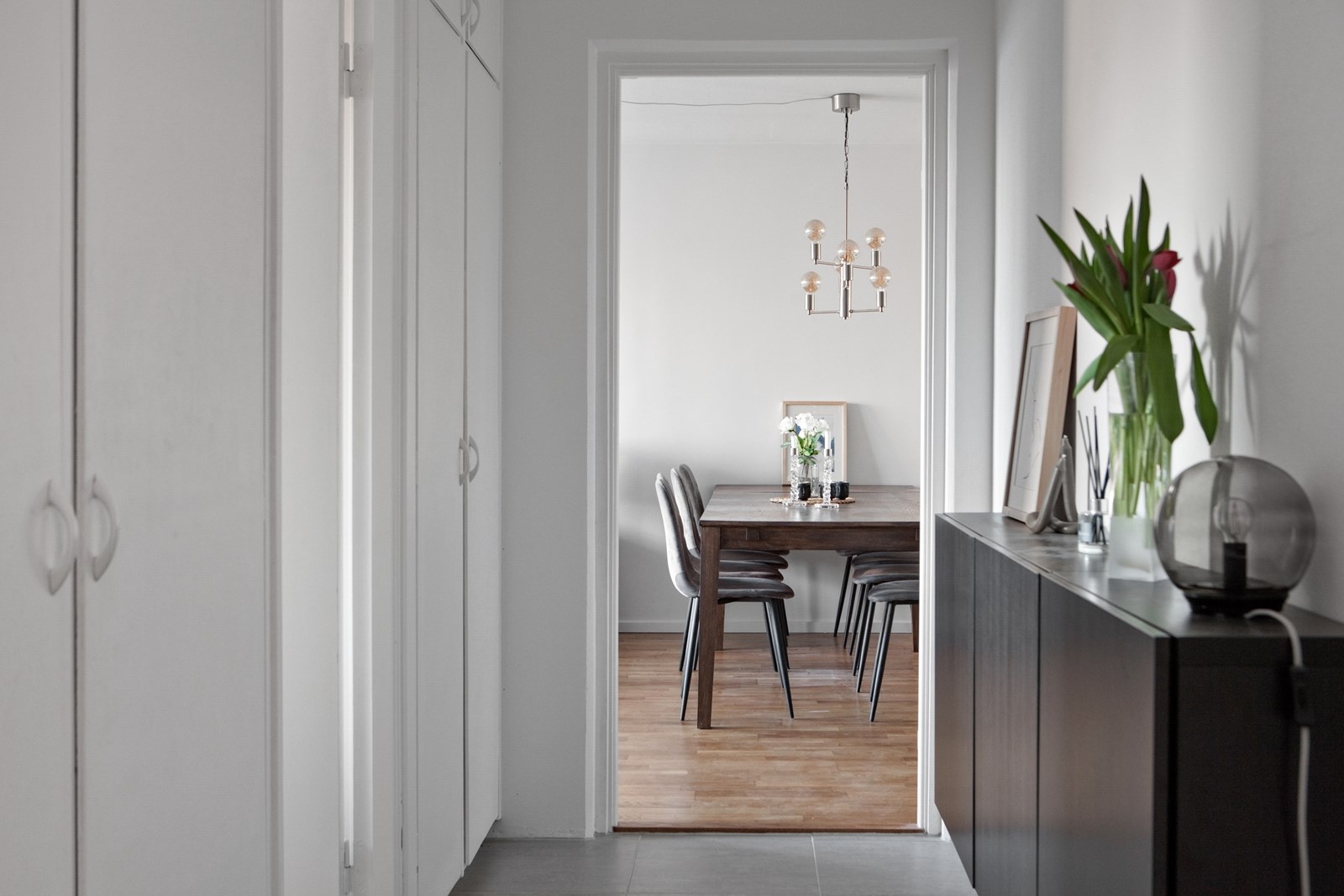 Klinkergolv och ljusmålade väggar. Hallen är möblerbar och erbjuder goda förvaringsmöjligheter i garderober samt avhängning i direkt anslutning till entrén.