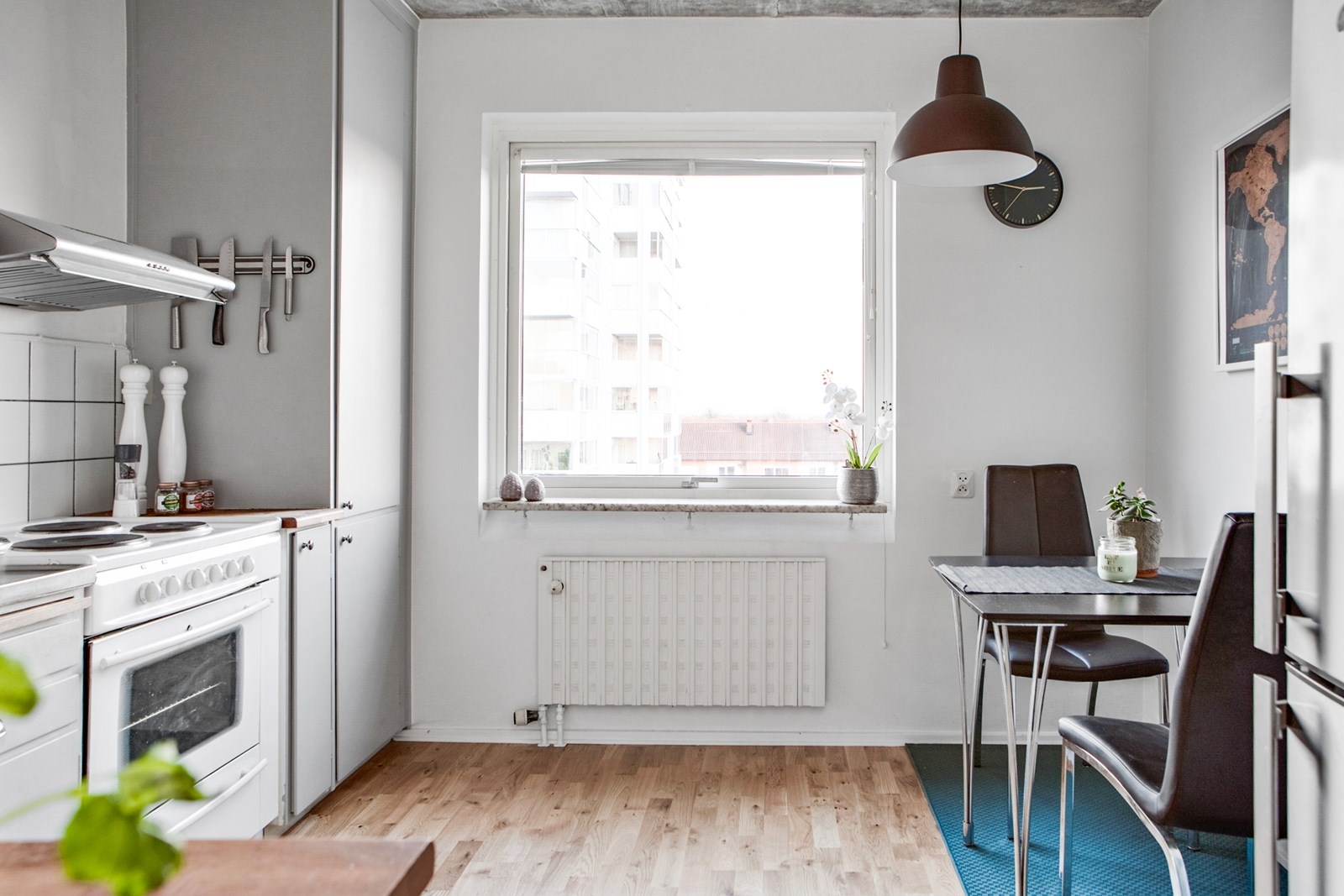 Parkettgolv och ljusa väggar. Köket är funktionellt utformat med bra arbetsytor, förvaring i över- och underskåp samt plats för matbord intill fönster. Utrustningen är placerad på ett praktiskt sätt som ger ett lättarbetat kök för vardagens behov.