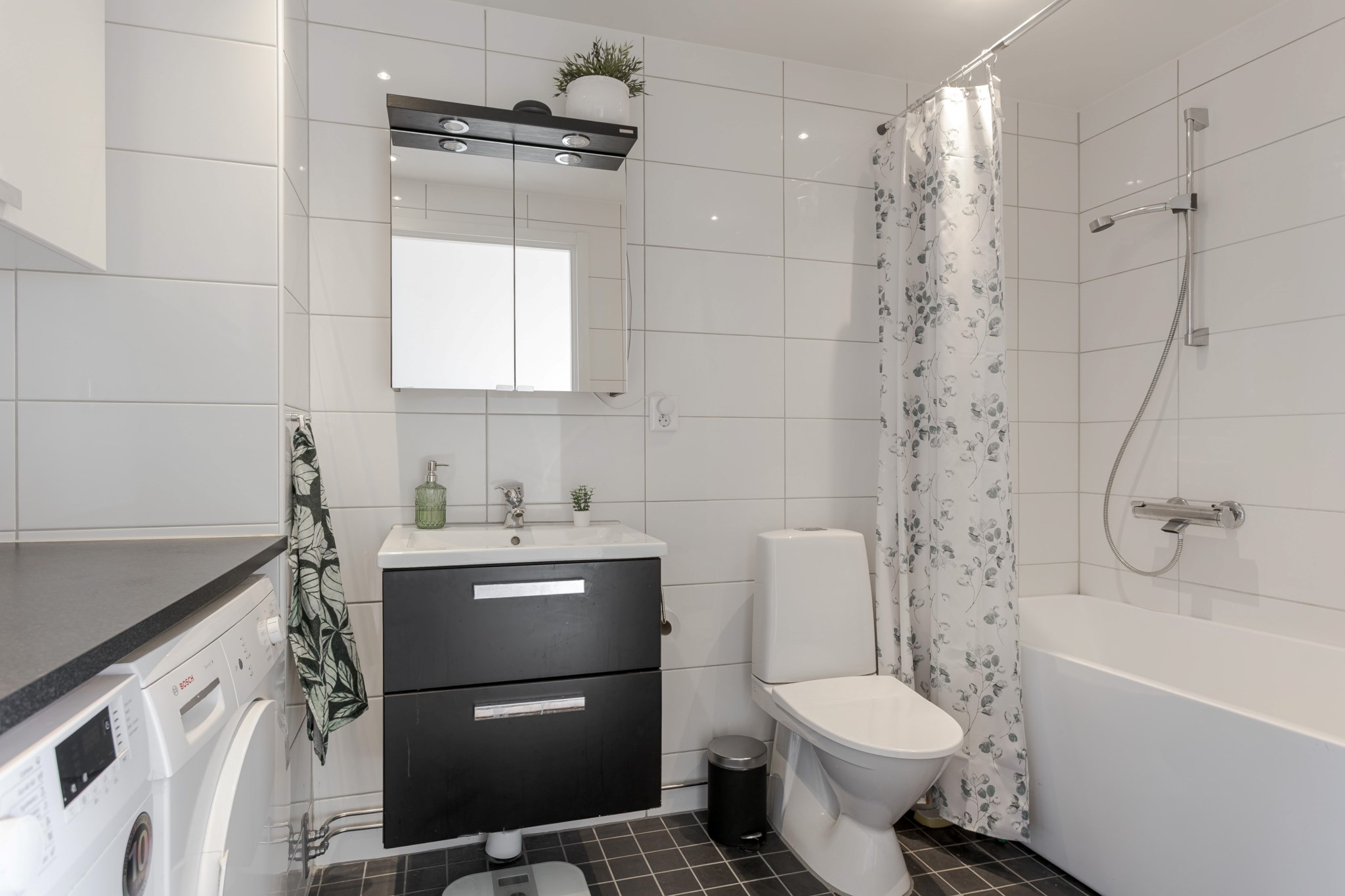 Klinkergolv och helkaklade vita väggar. Badrummet är utrustat med badkar, WC, kommod med stort handfat, väggskåp, tvättmaskin, torktumlare, spegel med inbyggd belysning och arbetsbänk med ovanhängande skåp för förvaring.