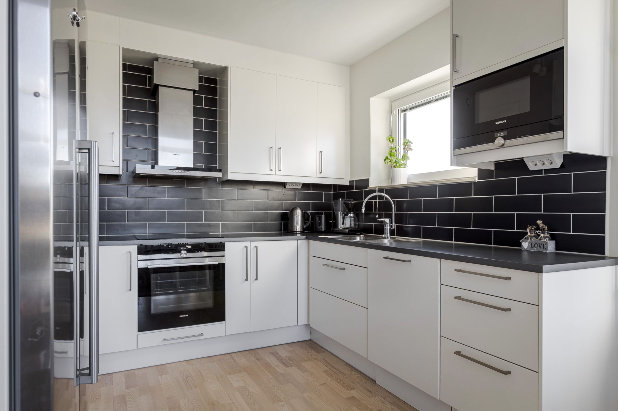 Ekparkett och ljusmålade väggar. Arbetsbänk i x och över det sitter rektangulärt kakel. Köket är utrustat med inbyggd ugn, induktionsspis, mikrovågsugn, diskmaskin, kyl/frys och köksfläkt. Öppen planlösning mot vardagsrum.