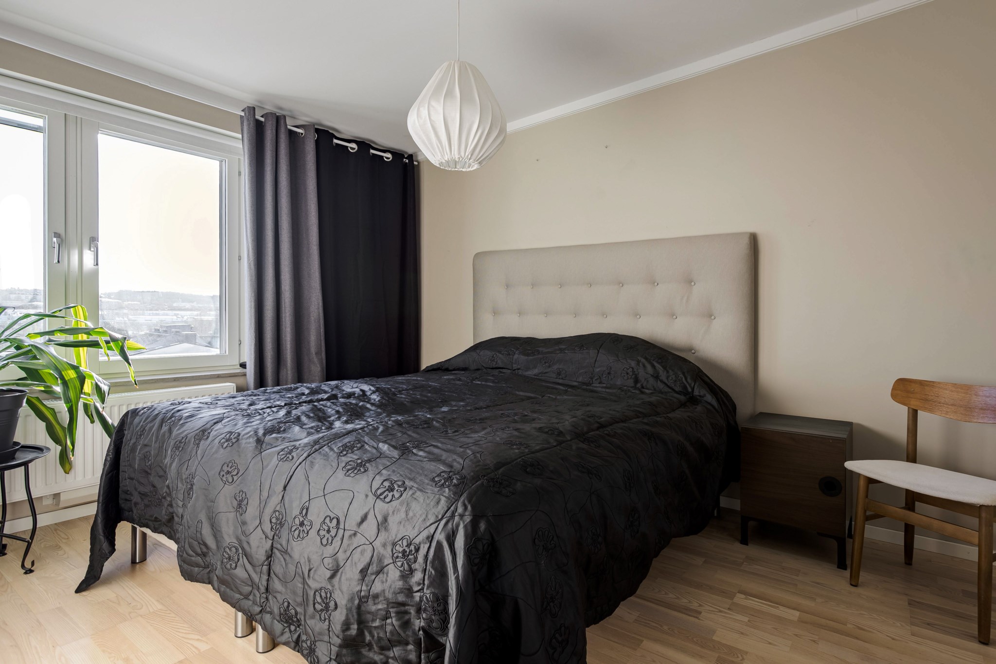 Ekparkett och ljusmålade väggar. Plats för dubbelsäng och förvaring i dubbelgarderob.