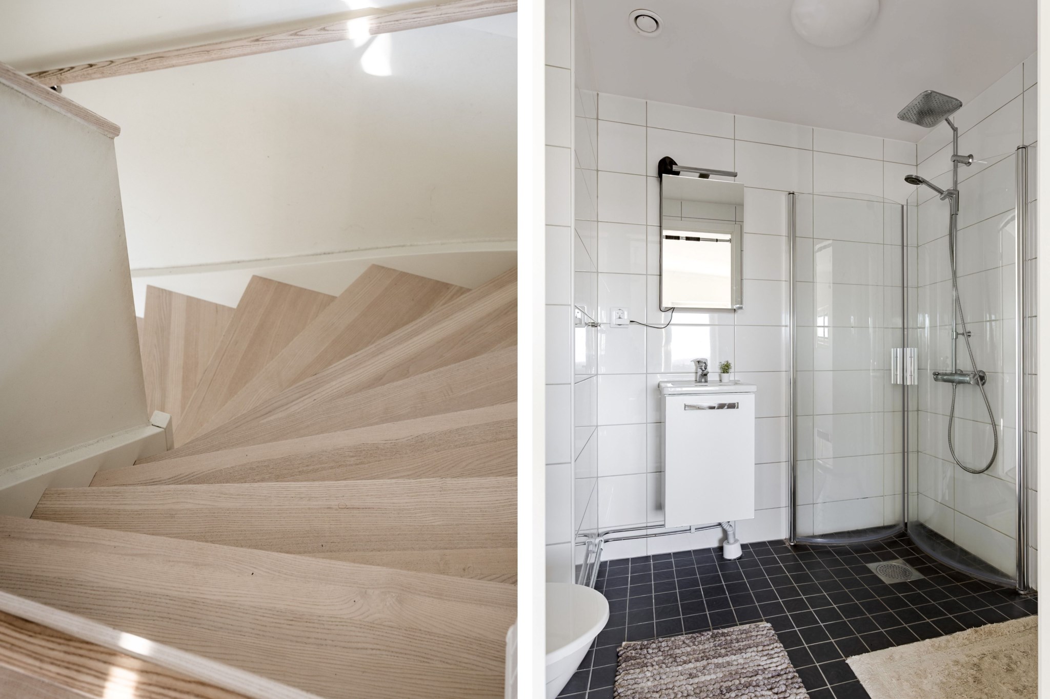Klinkergolv och helkaklade vita väggar. Badrummet är utrustat med dusch med vikbara glasdörrar, spegelskåp, kommod med handfat samt WC.