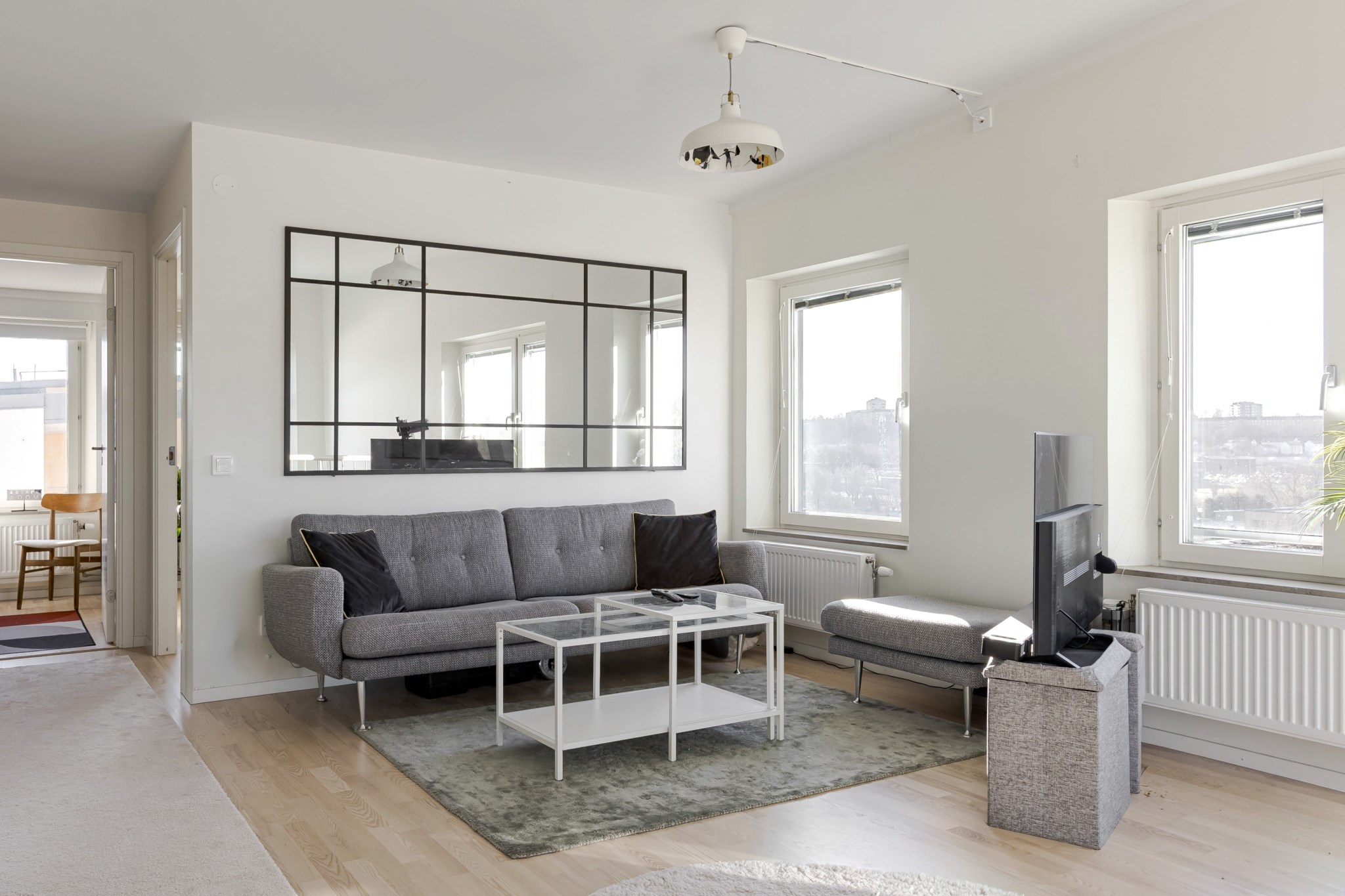 Ekparkett och ljusmålade väggar. Plats för stor sittgrupp och TV-möbel