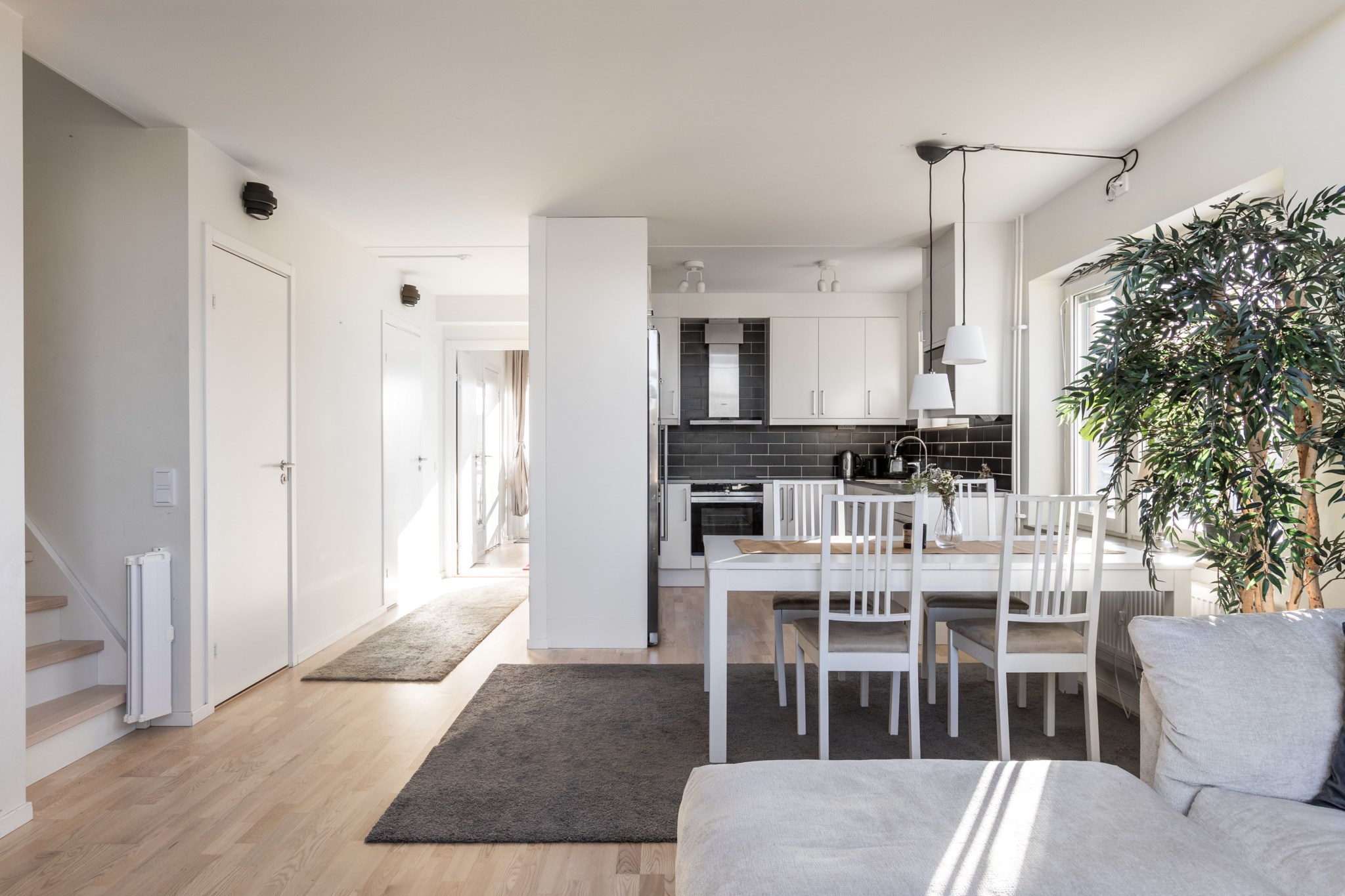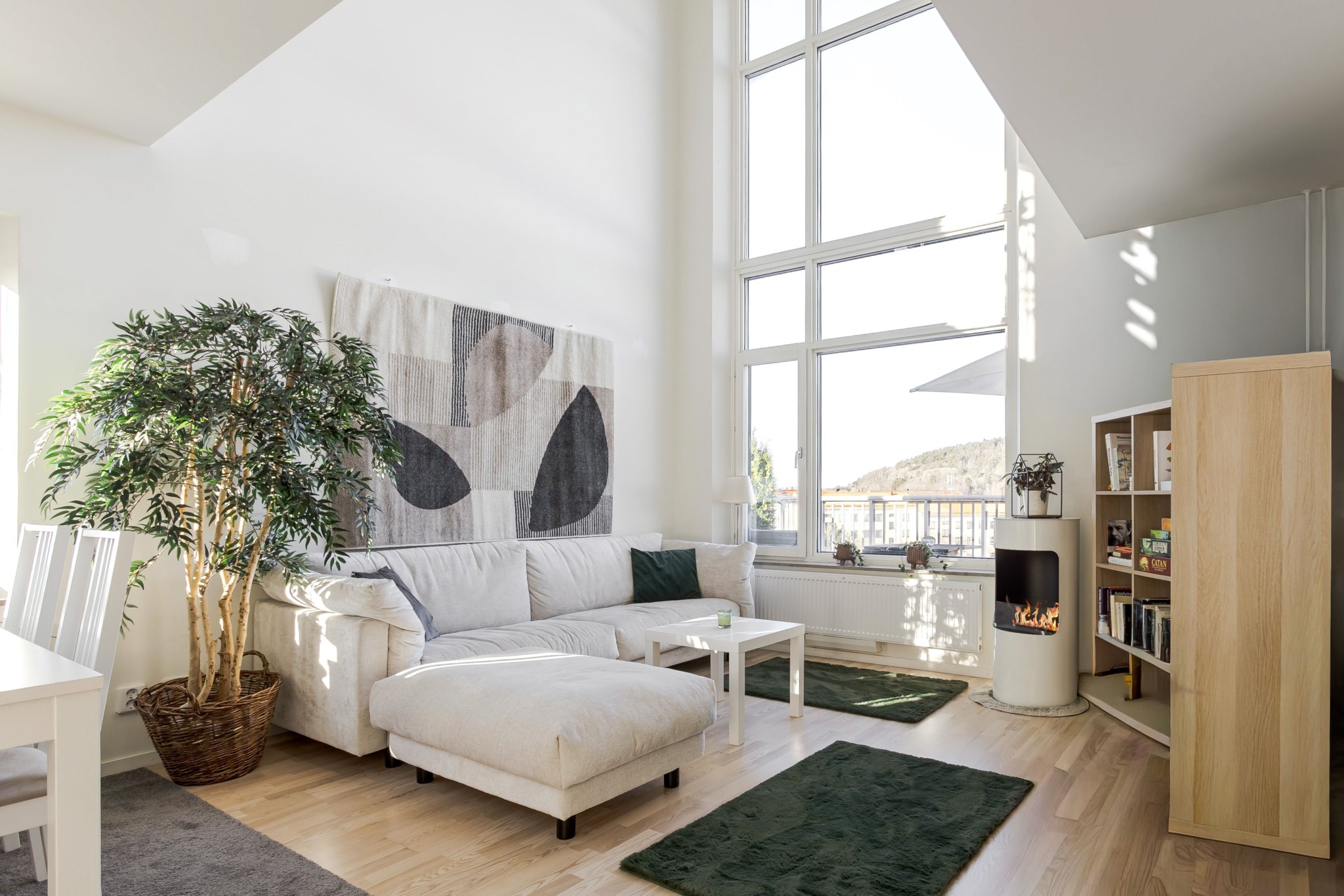 Ekparkett och ljusmålade väggar. Plats för matsalsbord, sittgrupp och TV-möbel. Öppen planlösning mot köket. och övre plan. Takhöjden 5m.