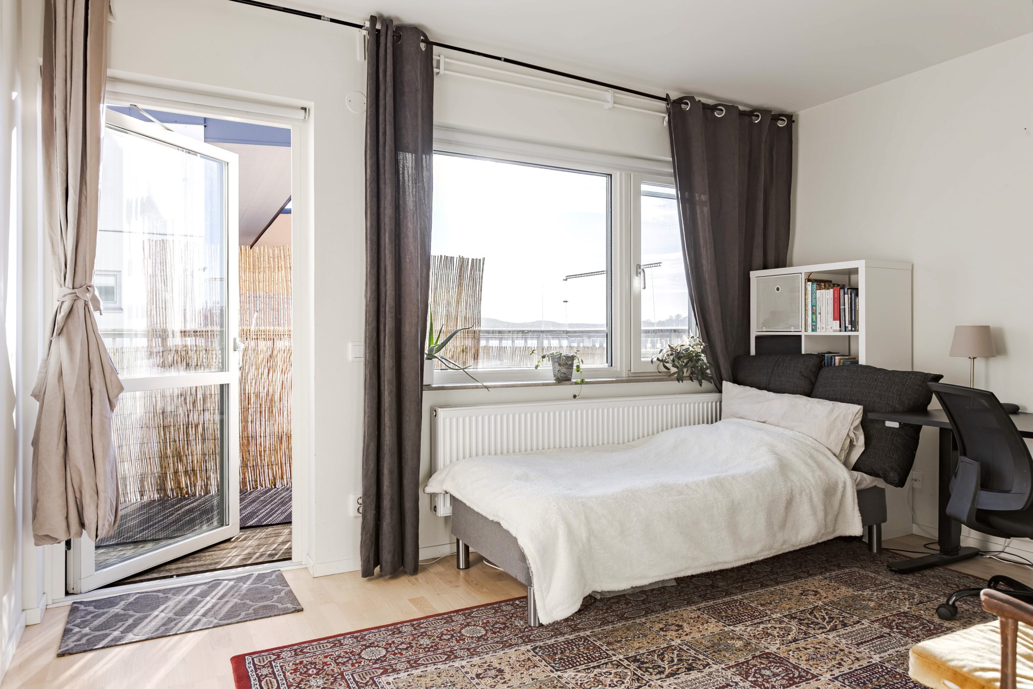 Ekparkett och ljusmålade väggar. Plats för dubbelsäng med sängbord. Förvaring i rymlig klädkammare. Egen utgång till balkongen.